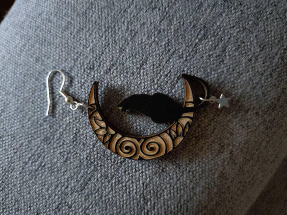 These wooden handmade dangle earrings feature a cute cat sitting on the moon and a golden star element. The earrings are beautifully laser cut and very lightweight, making them comfortable to wear all day. Not only are they stylish, but they are also environmentally friendly as they're made from sustainable wood. These earrings make a perfect addition to any outfit or as a unique gift for cat lovers and nature enthusiasts. So, add a touch of whimsy to your style with these adorable cat on the moon earrings..