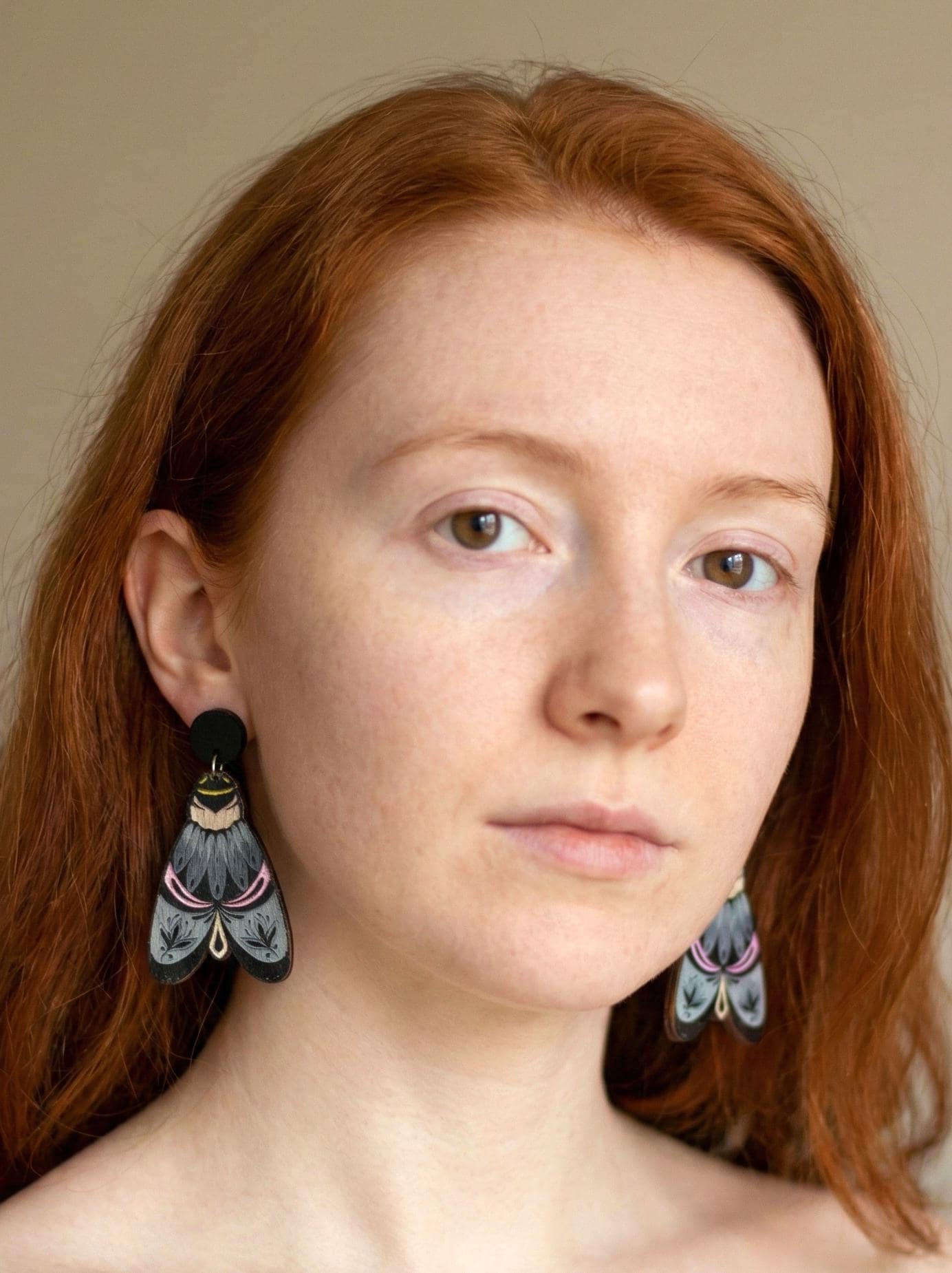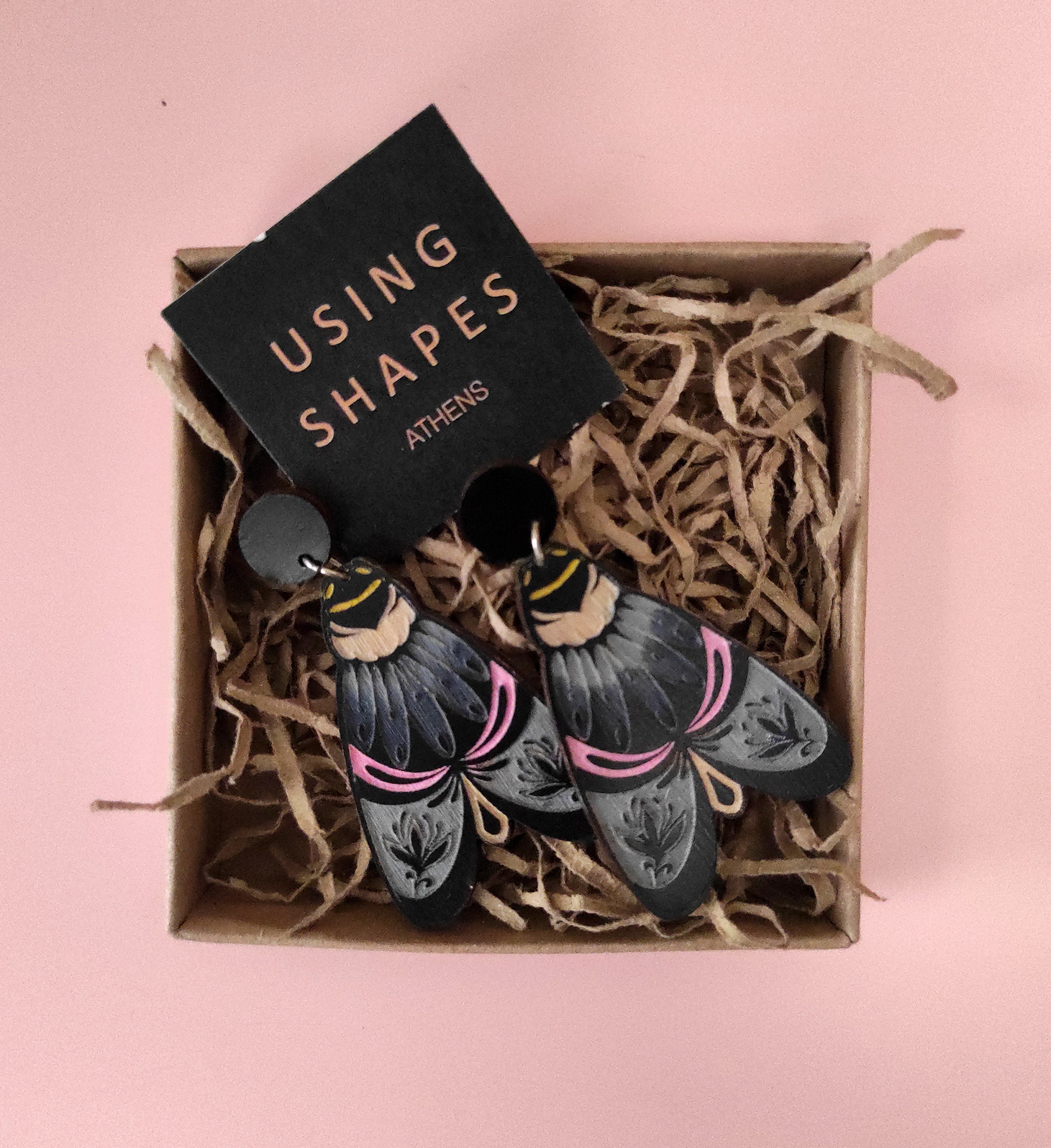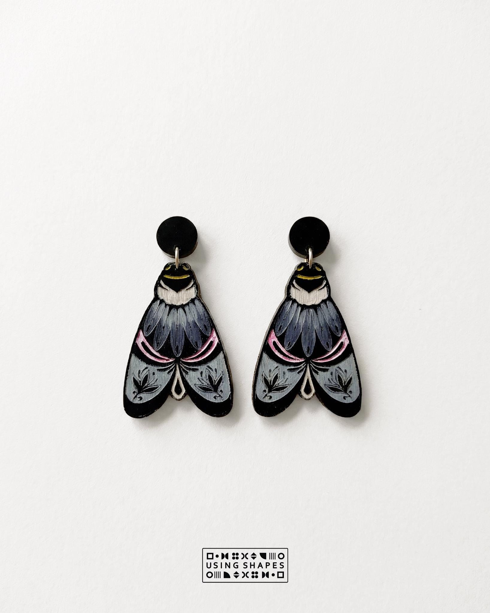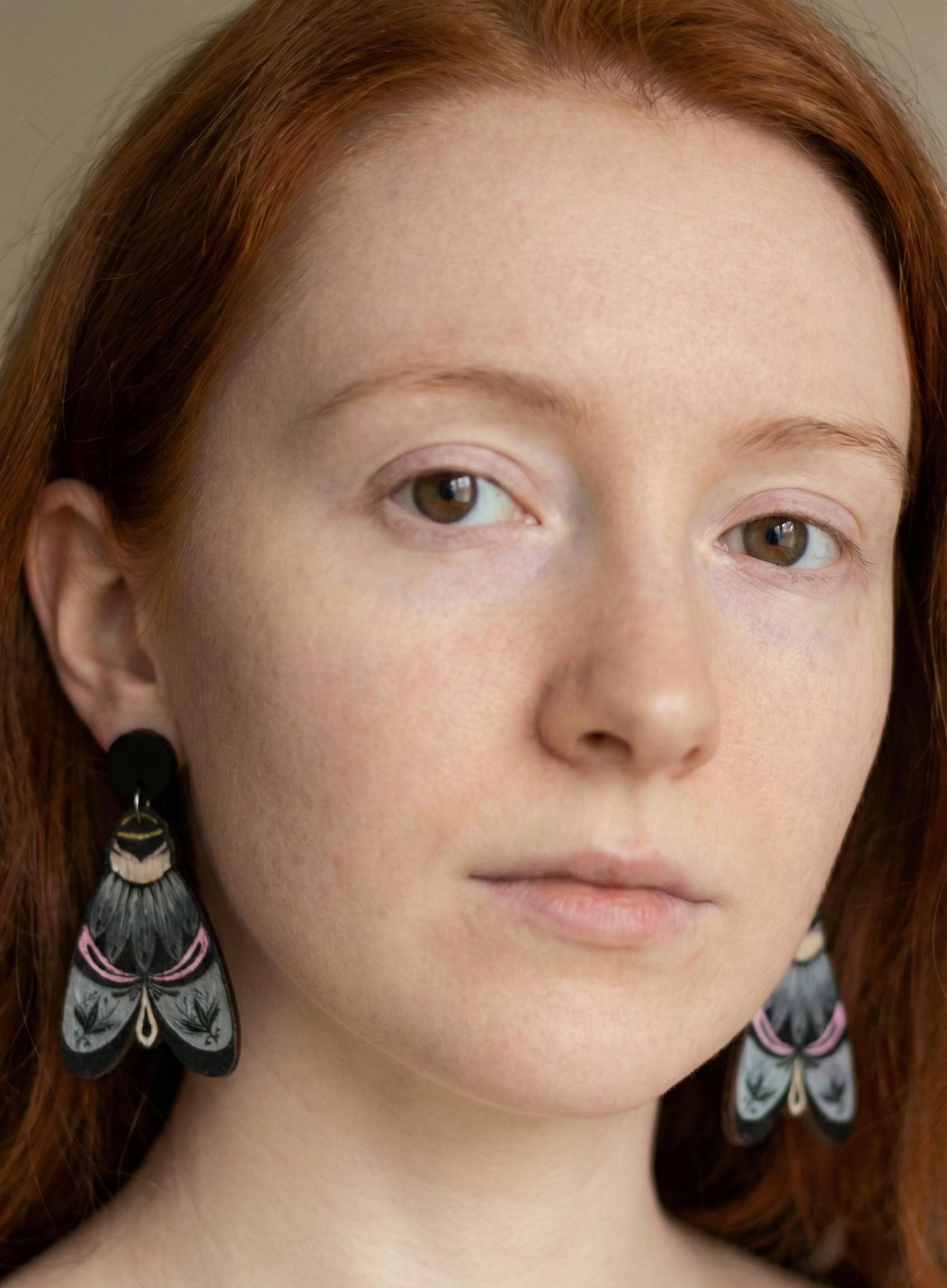 This item is hand painted pair of Moth wooden earrings.