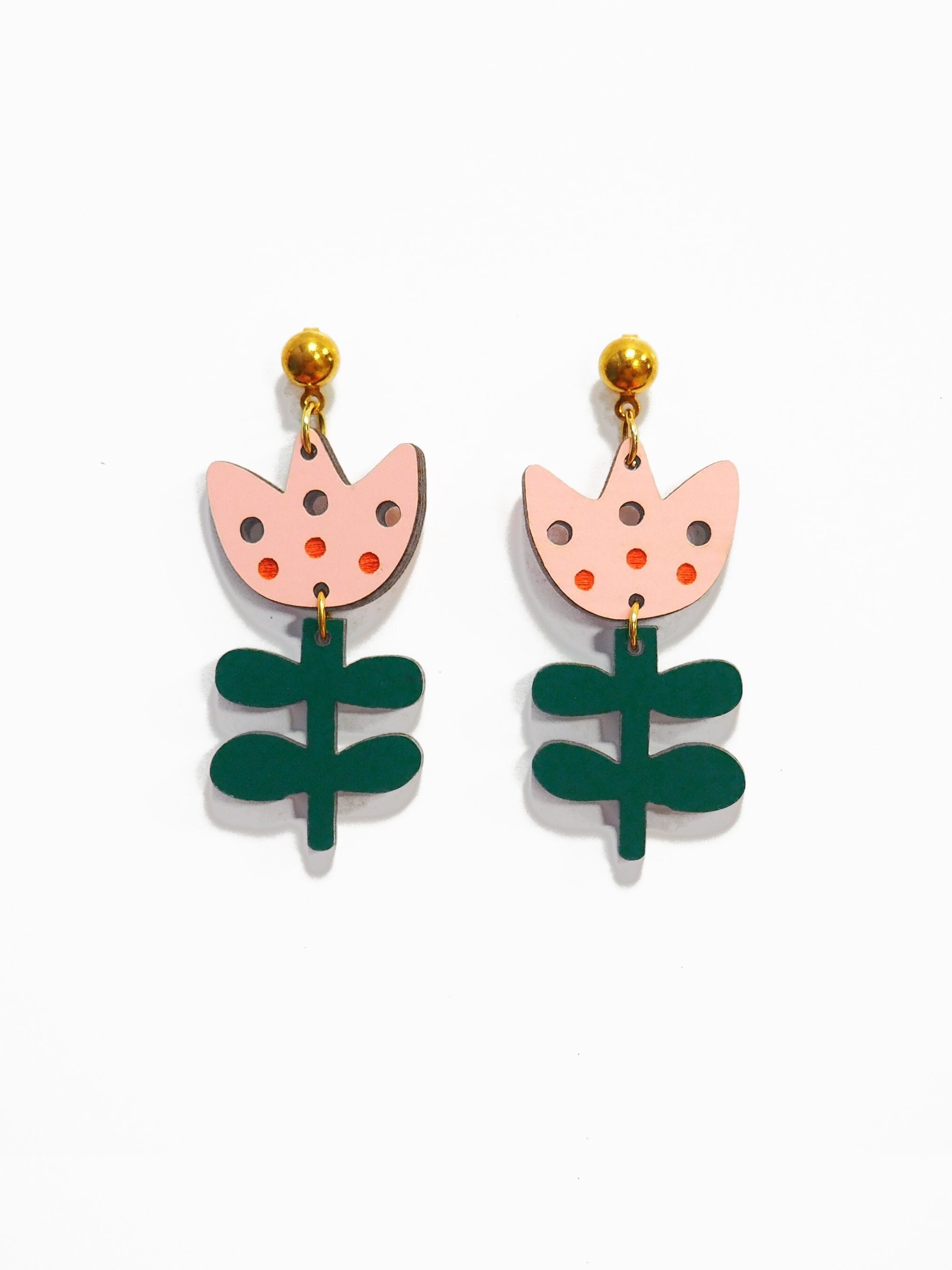 These Pink Flower Drop Earrings are hand-painted using a special technique that gives each piece its own unique character. They are laser-cut from 3mm birch plywood.