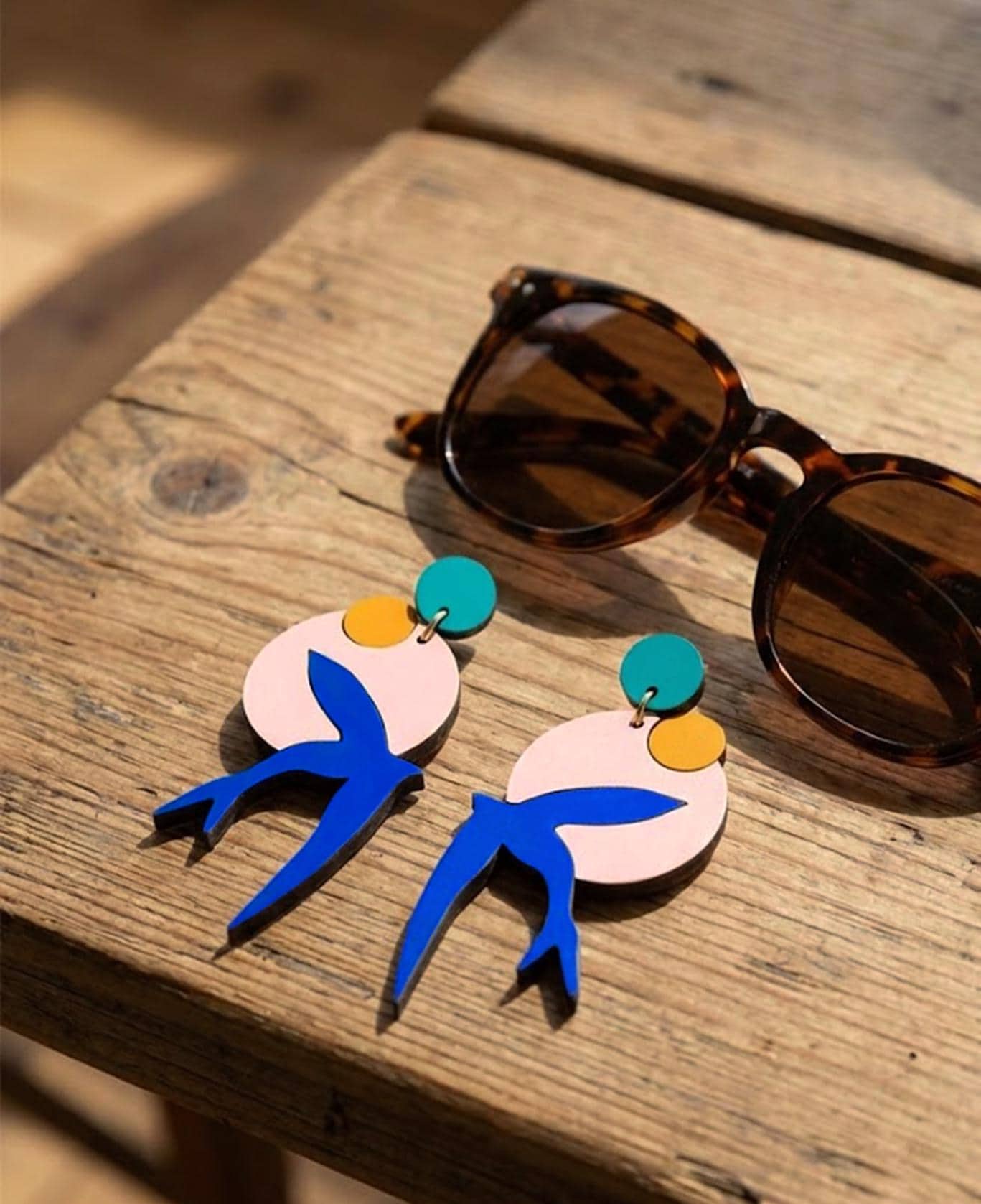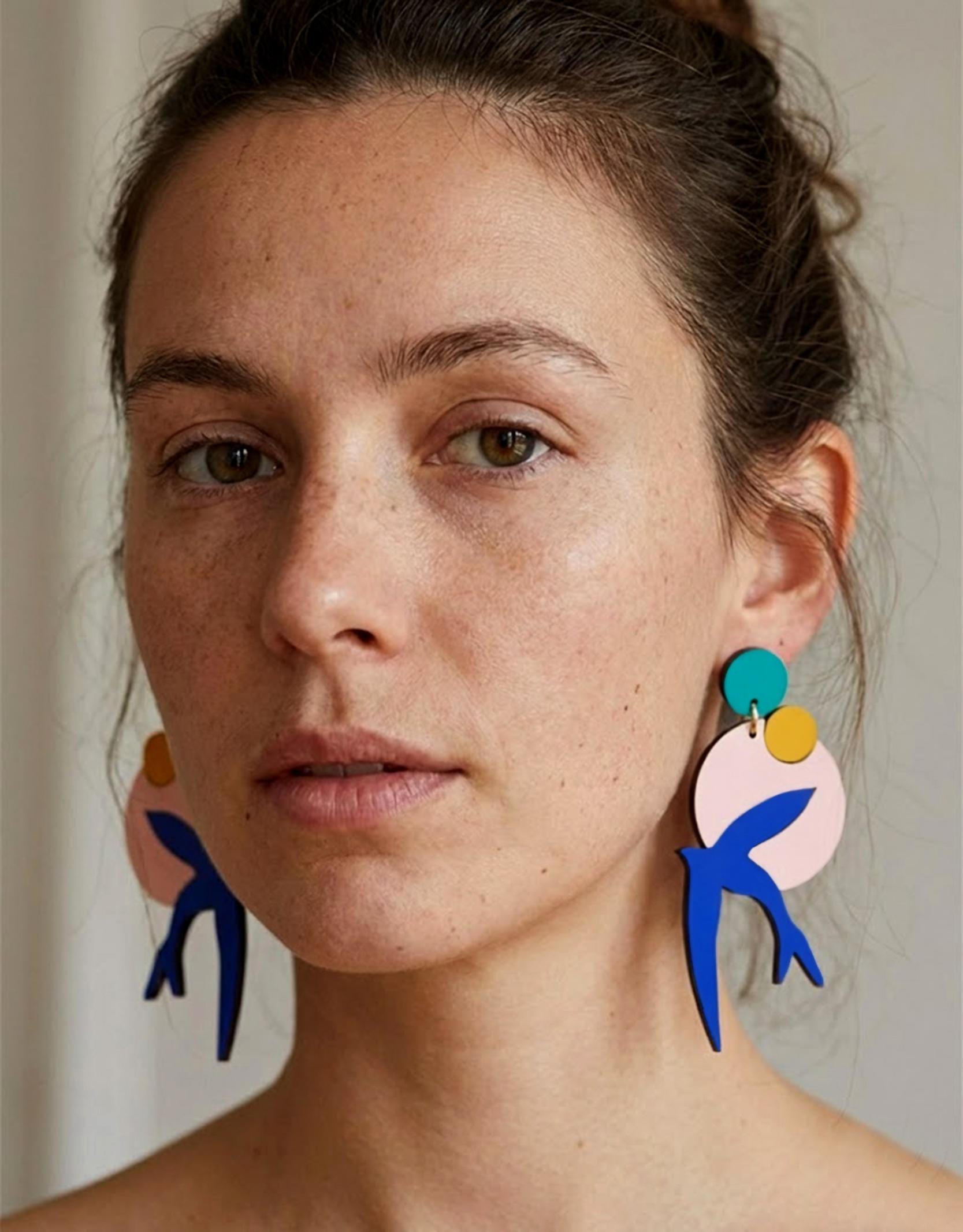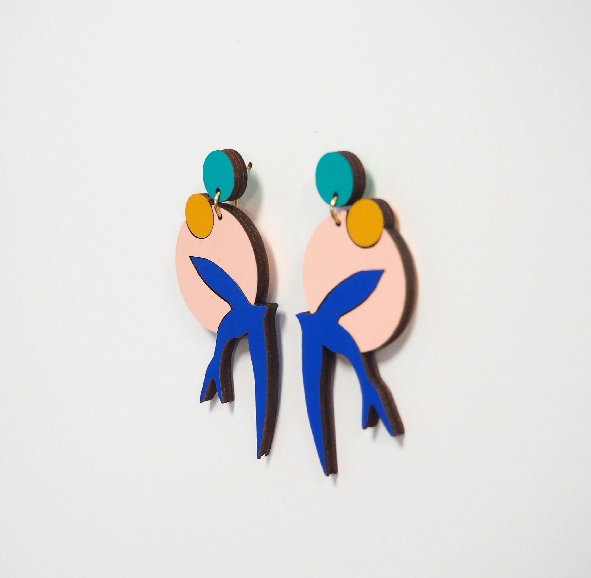 Matisse Bird Wooden Earrings, Hand Painted Drop Earrings.