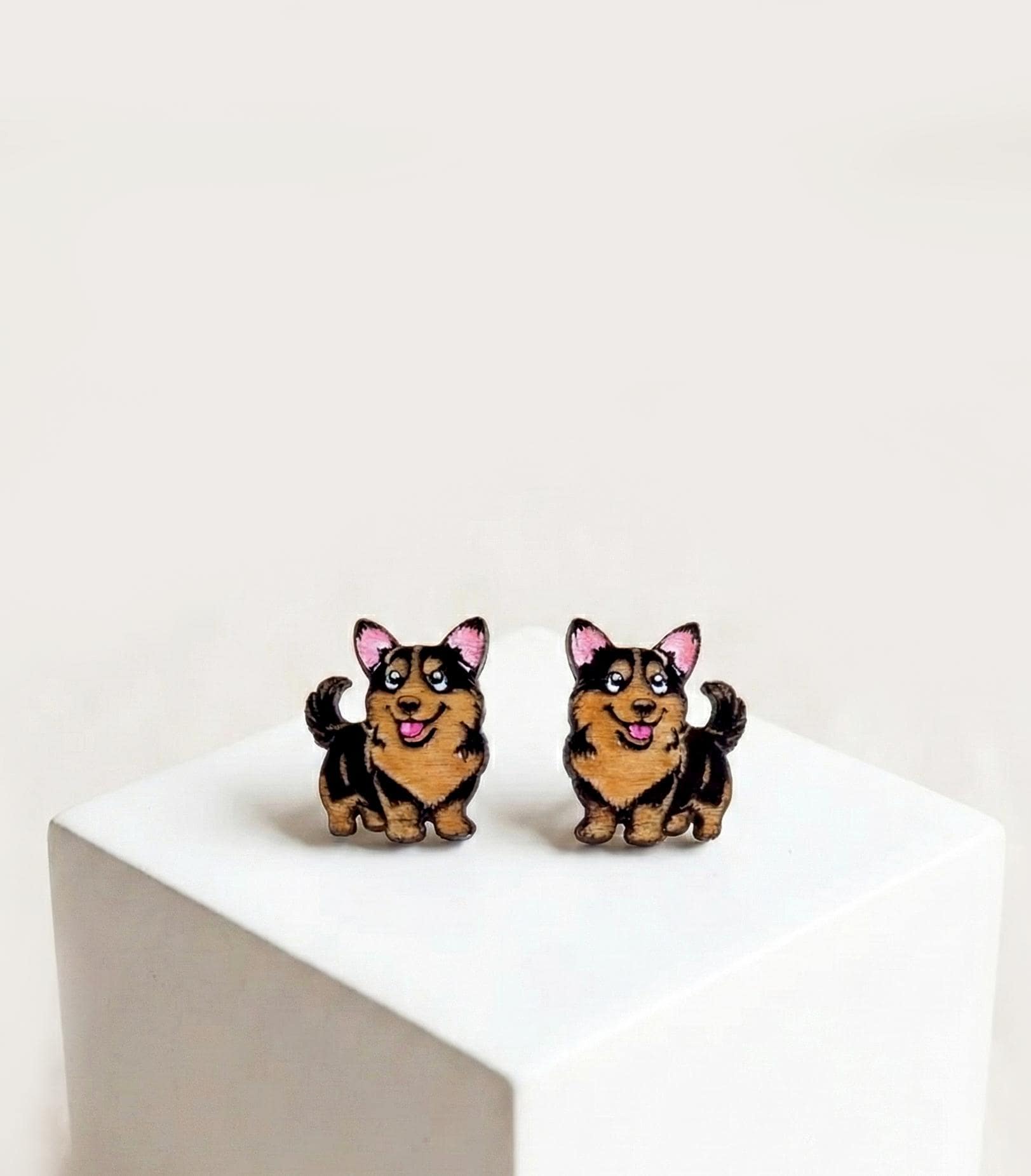 These Corgi stud earrings are hand-painted using a special technique that gives each piece its own unique character. They are laser-cut from 3mm birch plywood.