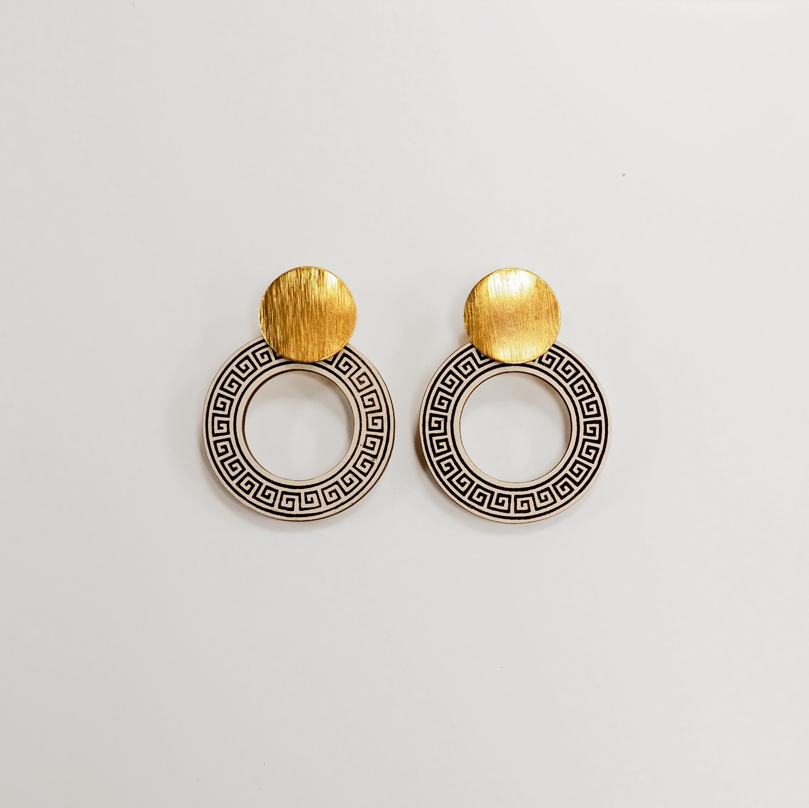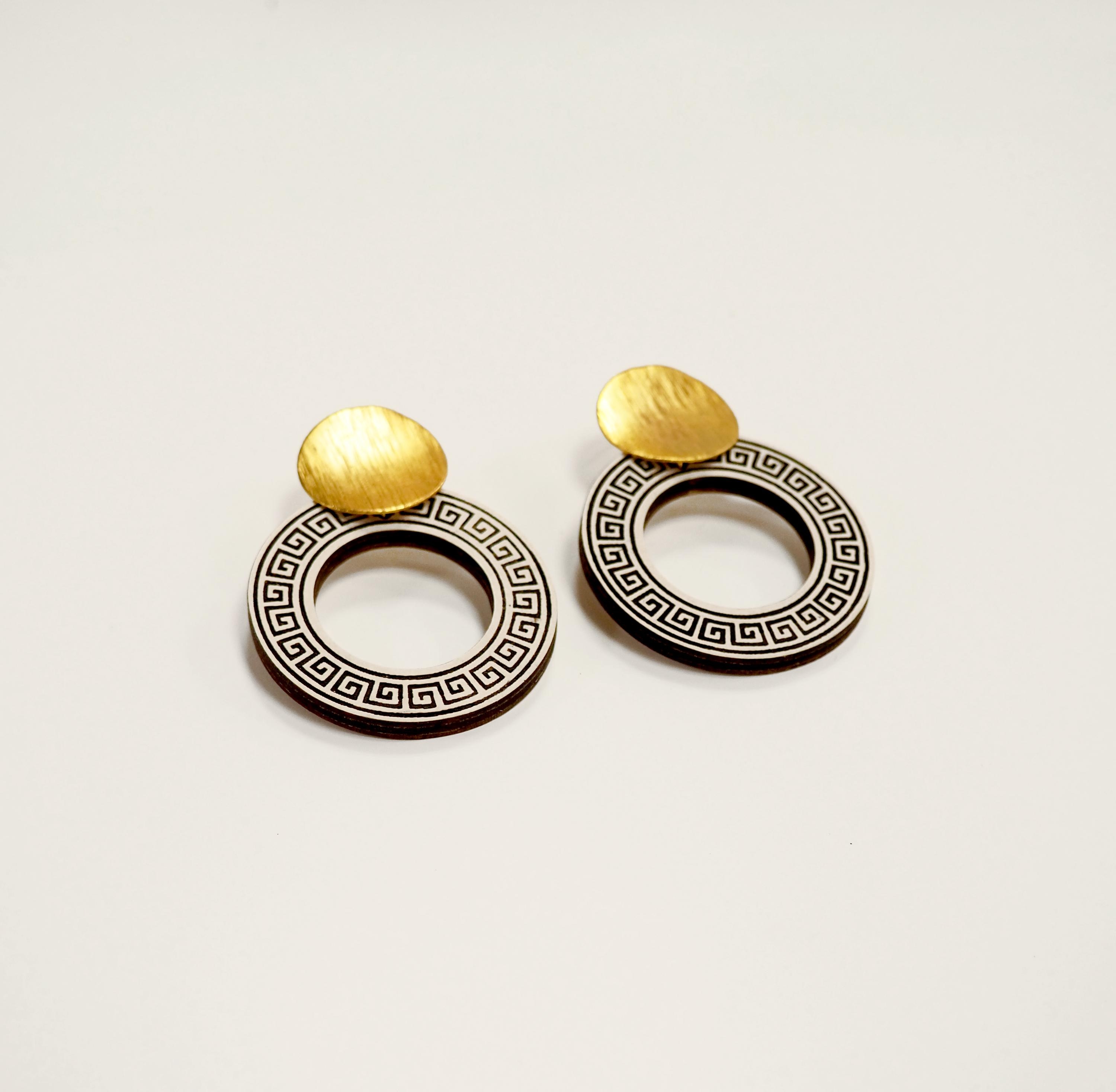 These handmade statement earrings are inspired by the timeless beauty of ancient Greek design. Each pair features a laser cut wooden circle engraved with the classic Greek key meander pattern, paired with elegant gold tone round studs for a modern yet historic look.