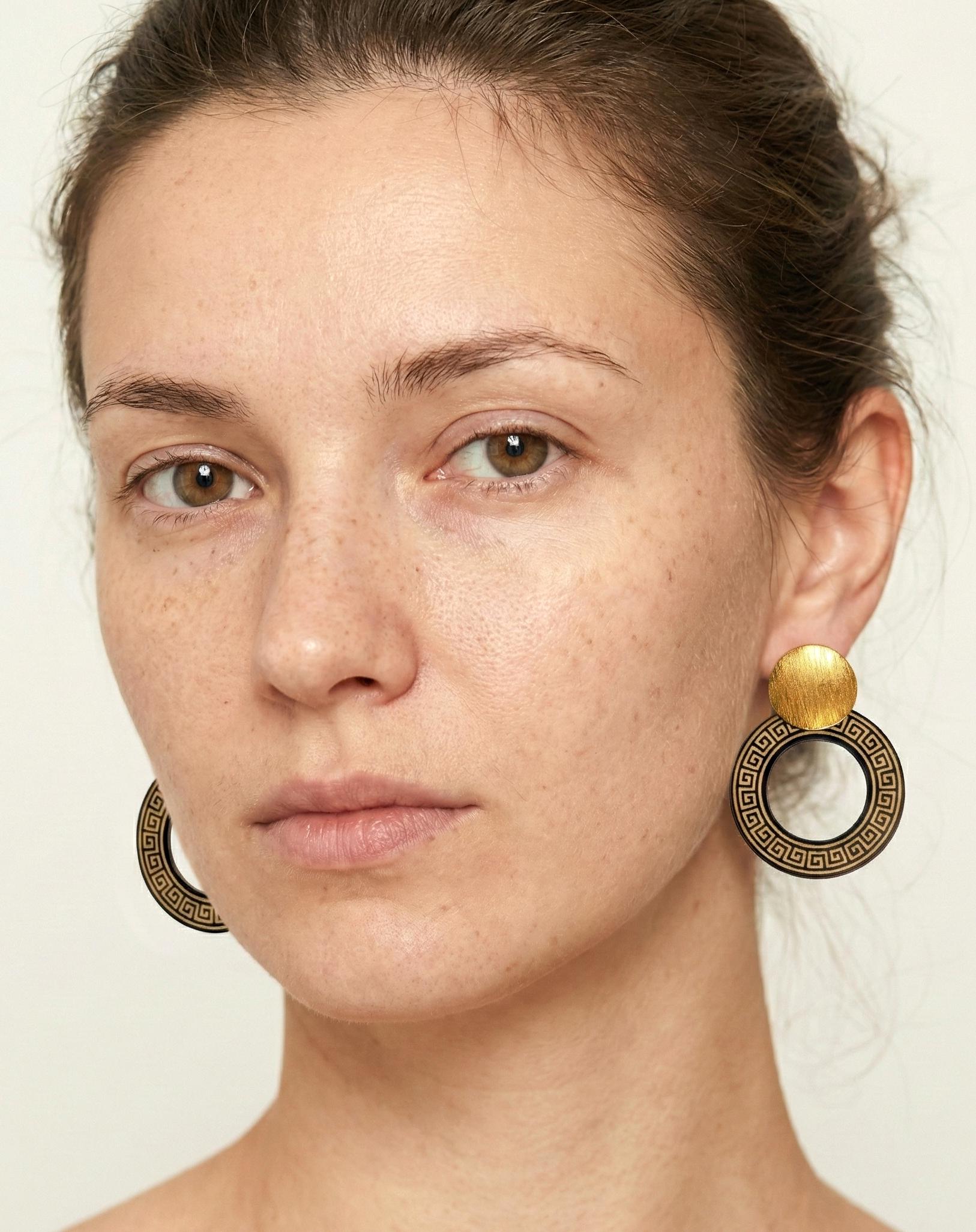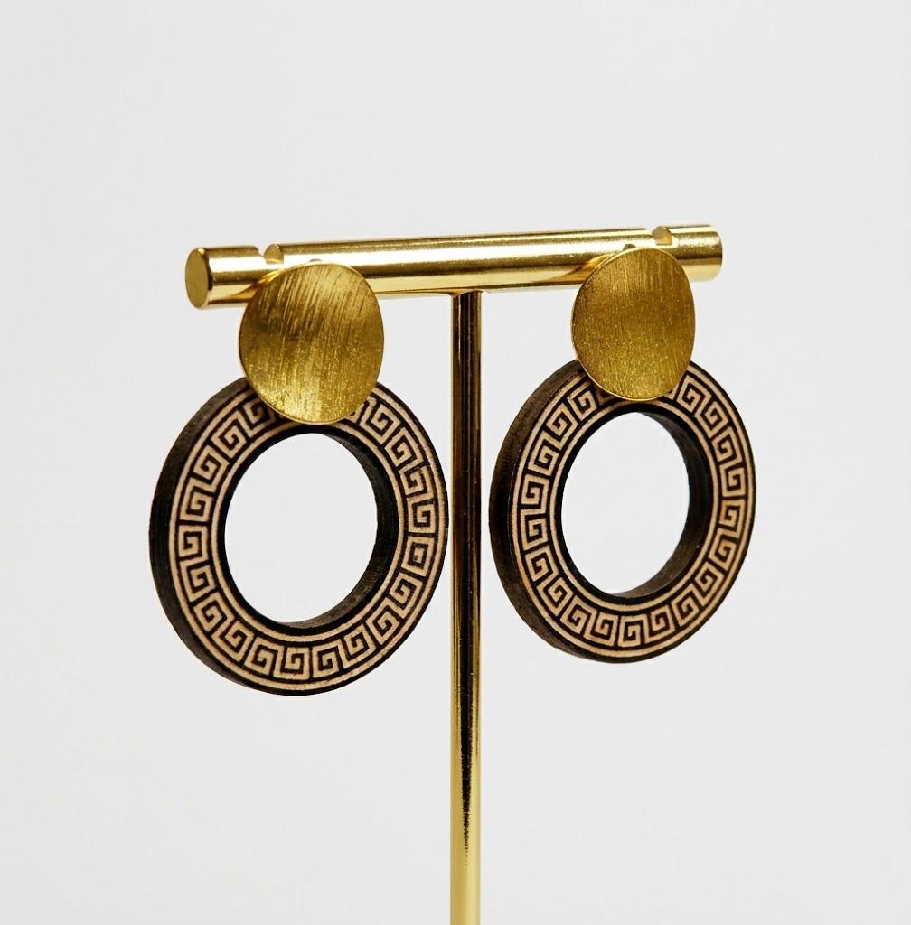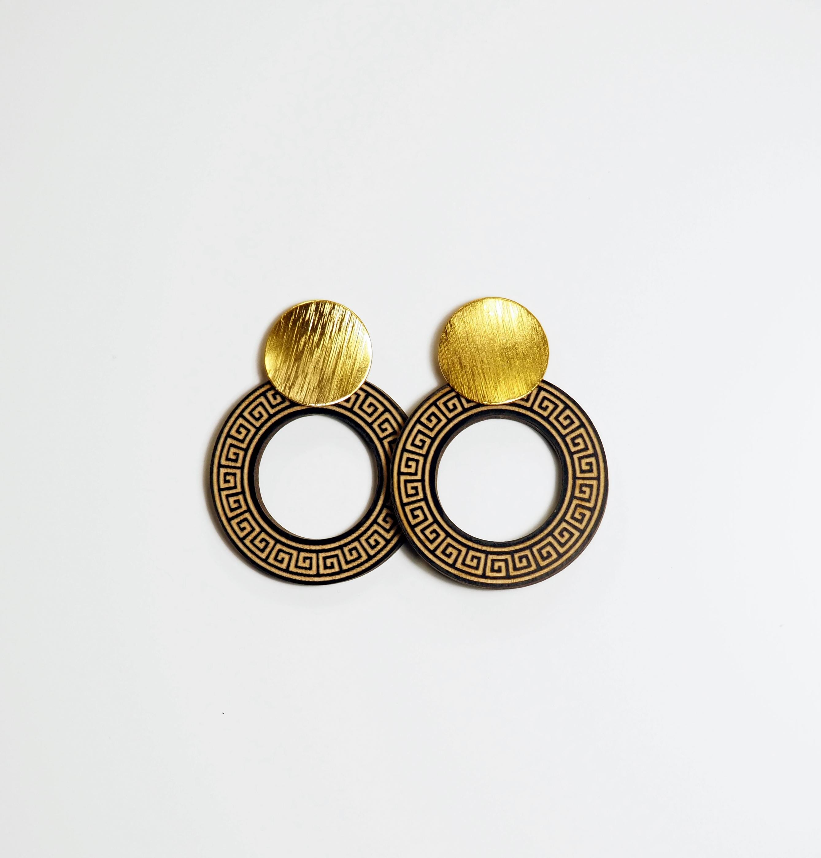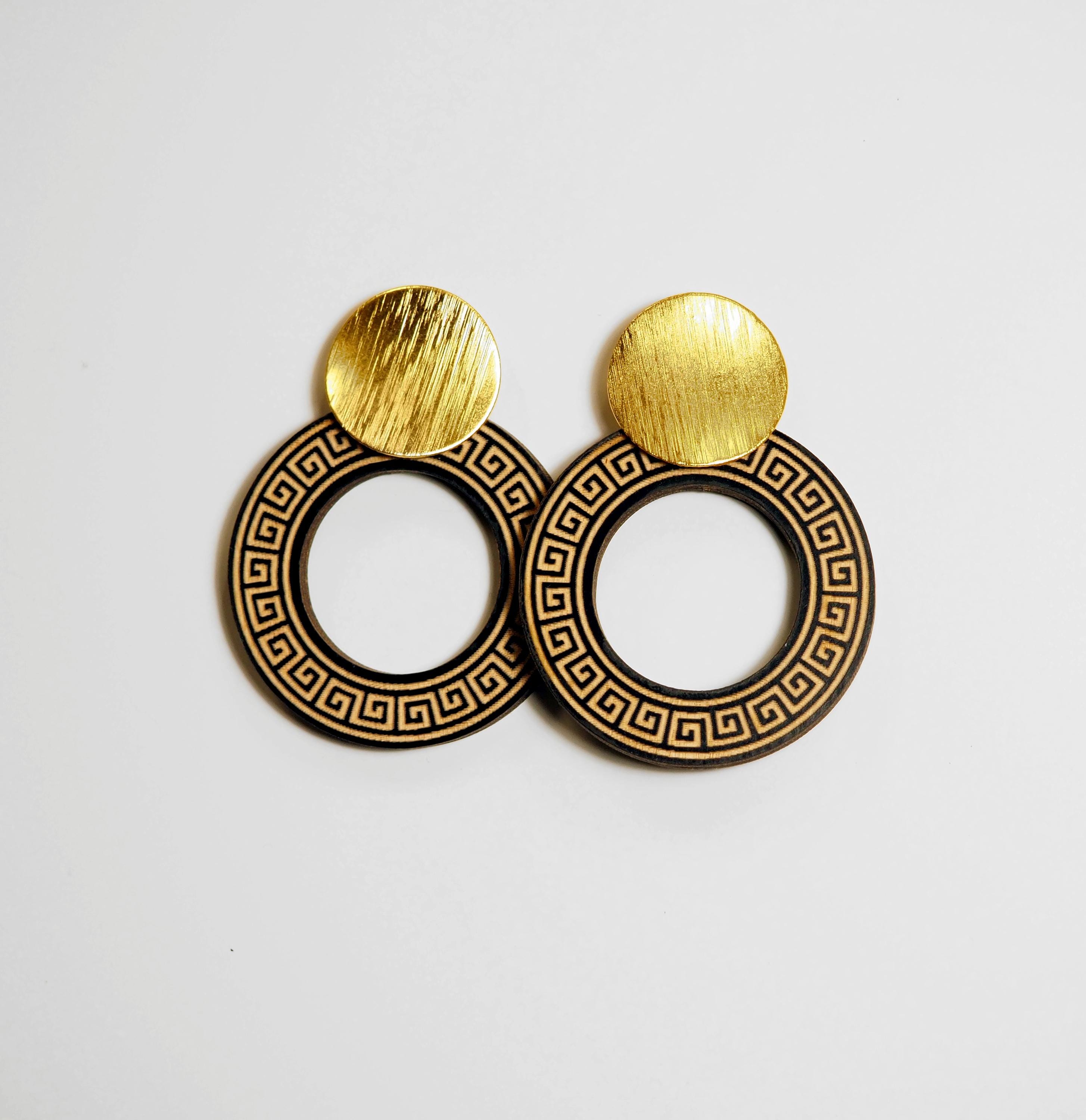 These handmade statement earrings are inspired by the timeless beauty of ancient Greek design. Each pair features a laser cut wooden circle engraved with the classic Greek key meander pattern, paired with elegant gold tone round studs for a modern yet historic look.