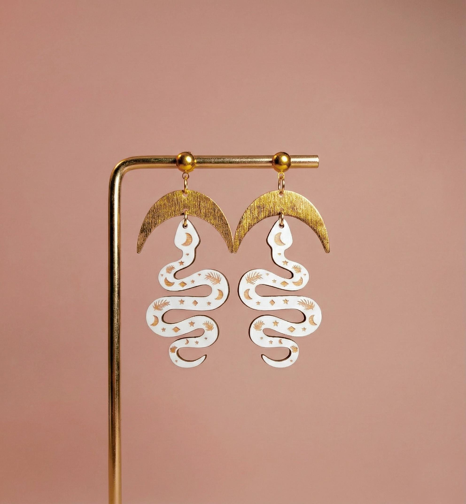 These handmade statement earrings feature an elegant serpent design decorated with delicate celestial motifs, including crescent moons, stars, and botanical details. The flowing snake shape is laser cut from wood and paired with warm gold tone elements that add contrast and depth.
