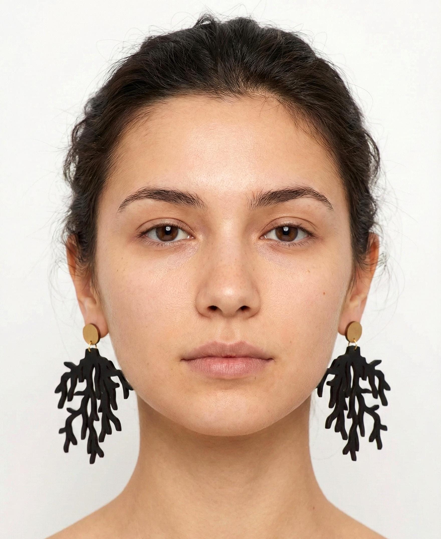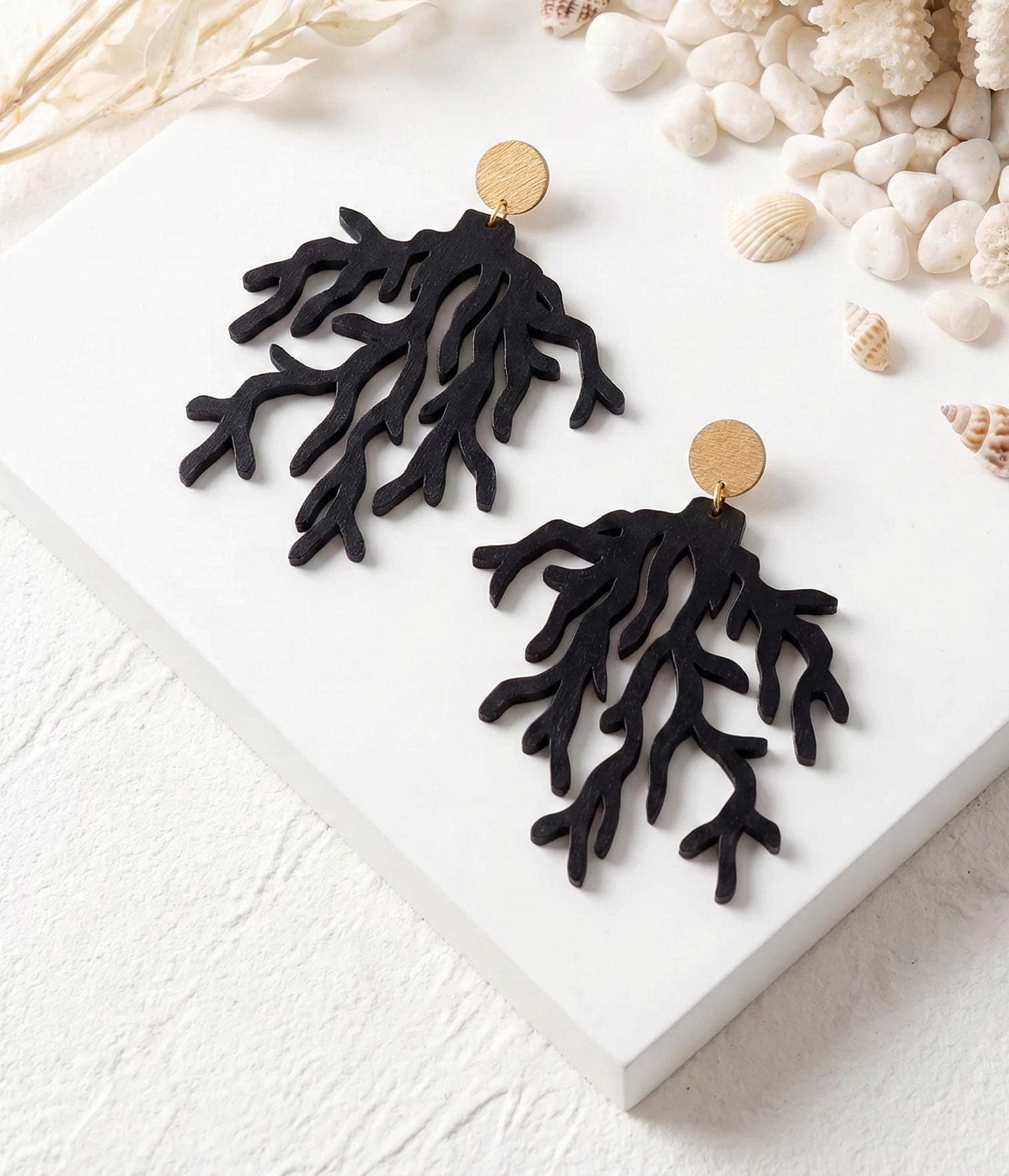 Make a bold and modern statement with these striking black organic dangle earrings. Inspired by natural forms such as coral branches, roots, and abstract botanical shapes, these earrings combine sculptural black silhouettes with warm gold tone studs for a refined yet artistic look.